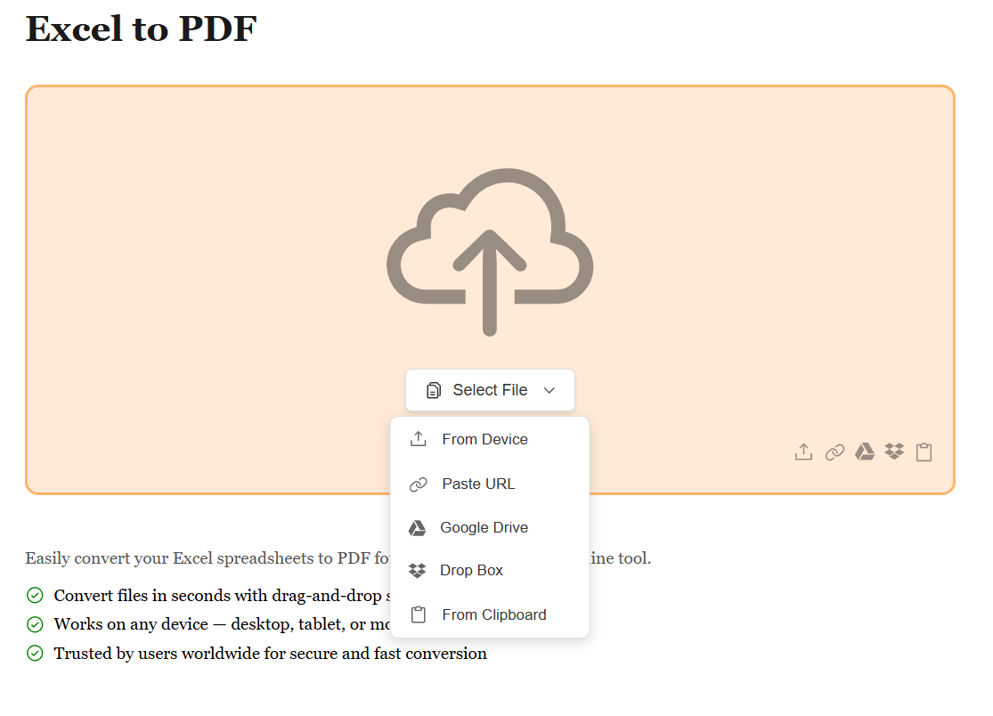 Start by uploading your Excel file (.xlsx, .xls) using the method that works best for you. Whether it's from your device, Google Drive, Dropbox, or by pasting a file URL, we support all sources. No matter where your spreadsheet is stored, converting it to PDF is just a click away.