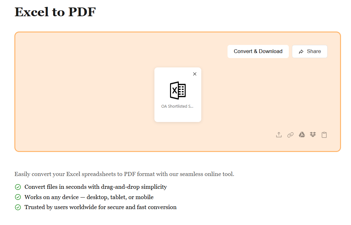 Easily convert your Excel spreadsheets to PDF format with our seamless online tool.