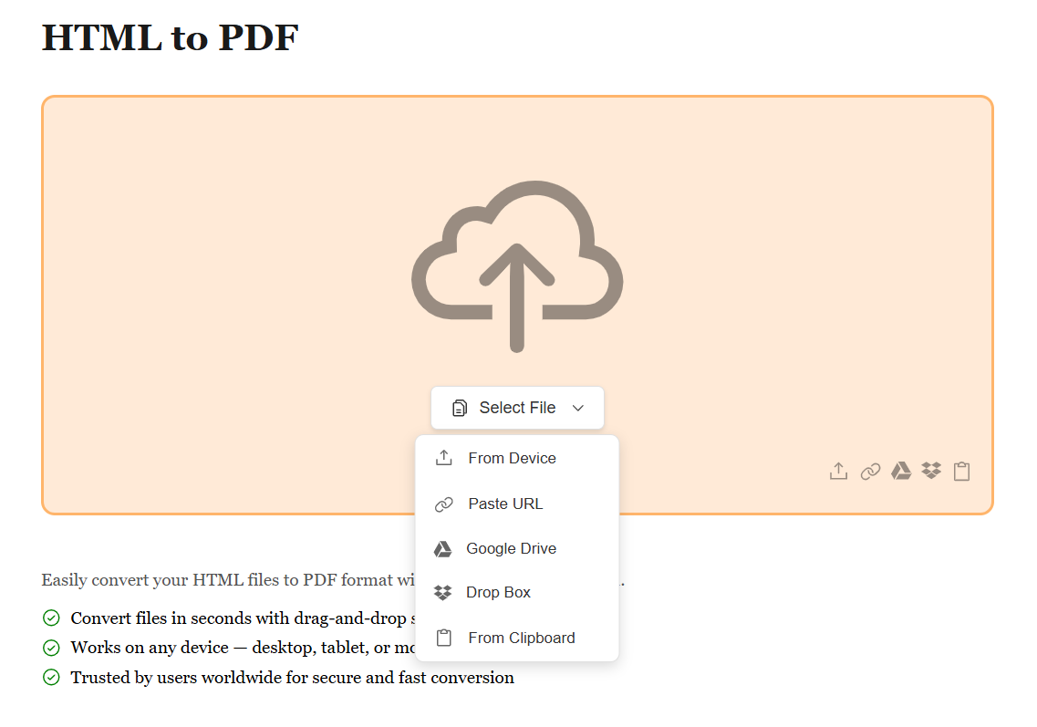 Start by uploading your HTML file or providing a webpage URL using the method that works best for you. Whether it's from your device, Google Drive, Dropbox, or by pasting a web URL, we support all sources. No matter where your HTML content is stored, converting it to PDF is just a click away.