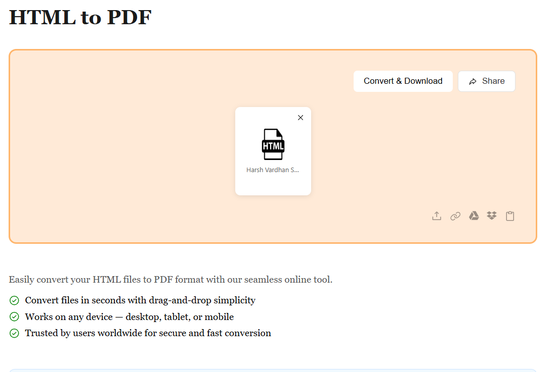 Easily convert your HTML files to PDF format with our seamless online tool.
