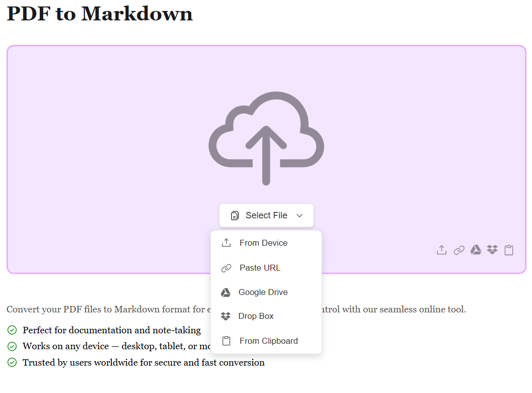 Start by uploading your PDF file using the method that works best for you. Whether it's from your device, Google Drive, Dropbox, or by pasting a file URL, we support all sources. No matter where your PDF is stored, converting it to clean Markdown format is just a click away.