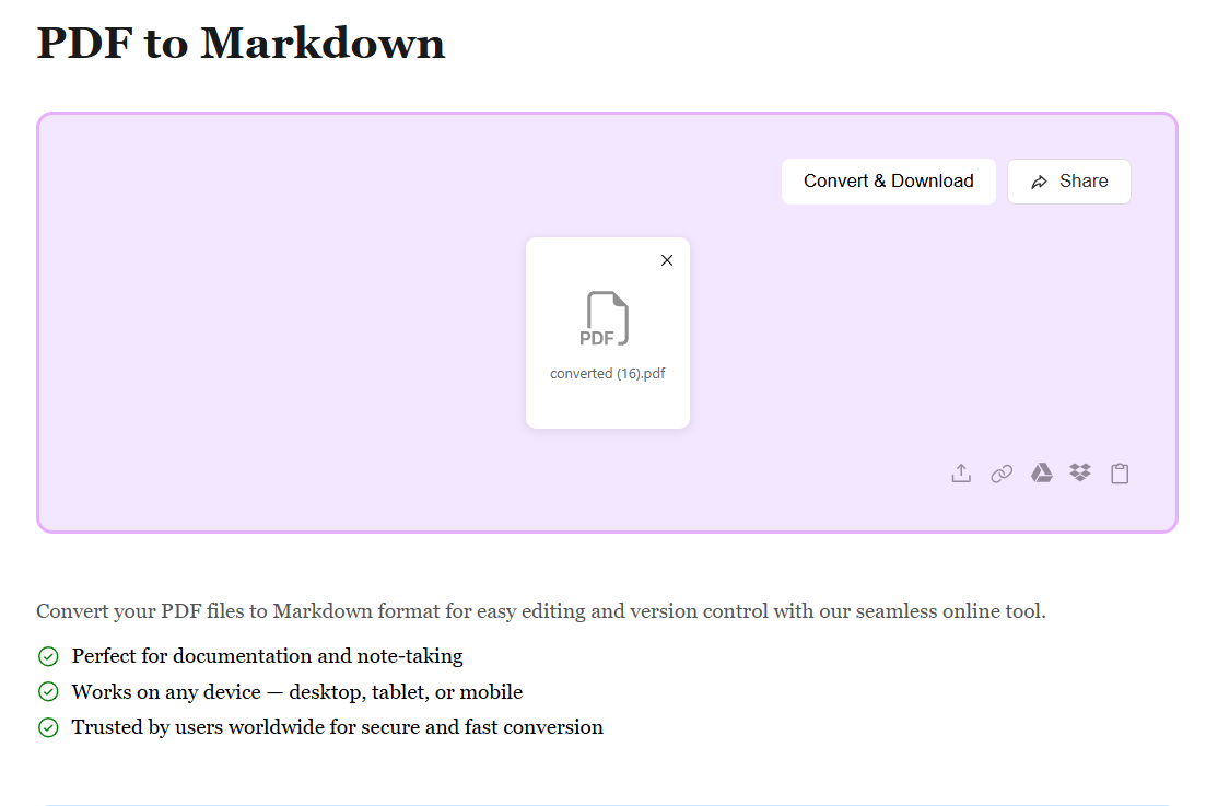 After conversion, your PDF is transformed into a clean Markdown file (.md). Preview the results and hit Download to get your file. Your Markdown is ready to use in documentation, GitHub, wikis, or any text editor — lightweight, portable, and easy to edit.