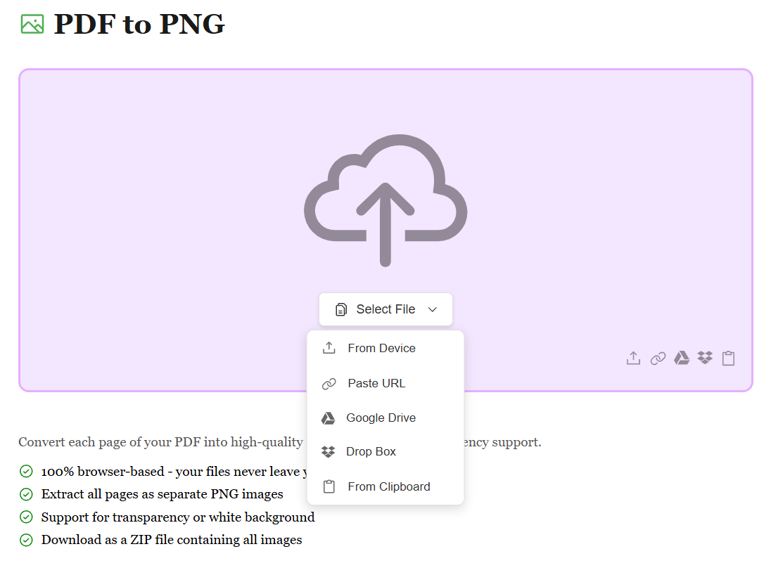 Start by uploading your PDF file using the method that works best for you. Whether it's from your device, Google Drive, Dropbox, or by pasting a file URL, we support all sources. No matter where your PDF is stored, converting it to high-quality PNG images is just a click away.