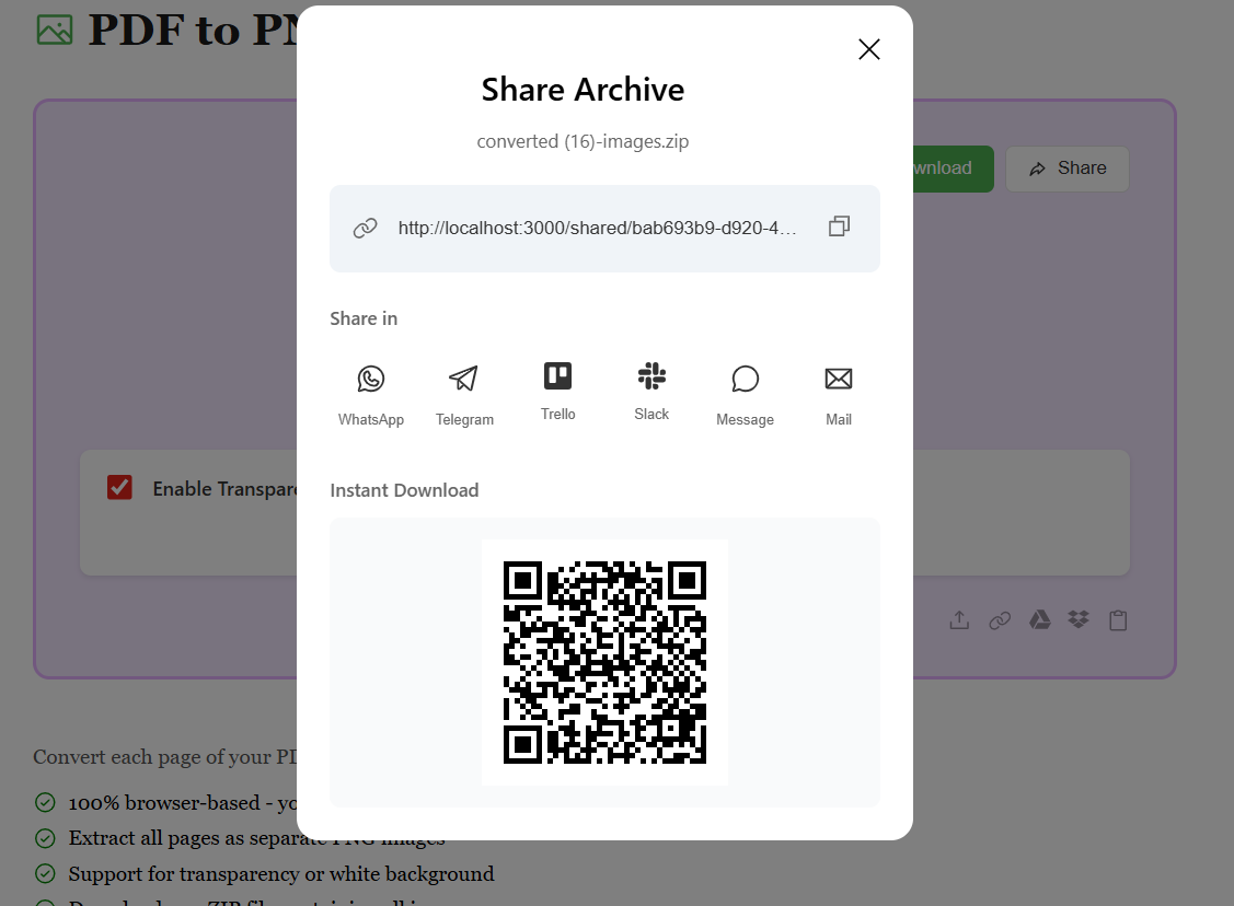 After conversion, all your PDF pages are transformed into individual PNG images and packaged in a convenient ZIP file. Preview the results and hit Download to get your files. Your images are ready to share, edit, or use anywhere — with lossless quality and transparency support.