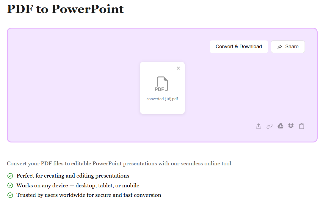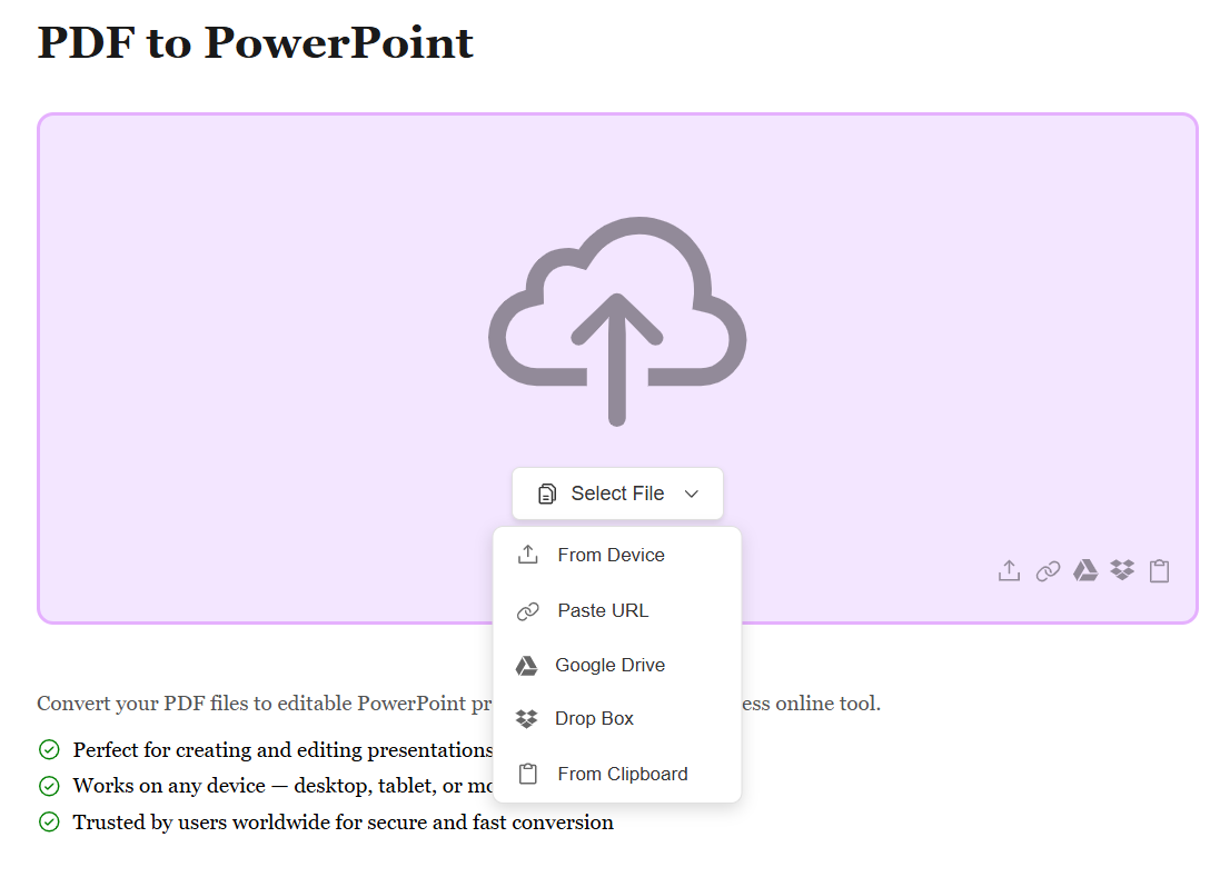Start by uploading your PDF file using the method that works best for you. Whether it's from your device, Google Drive, Dropbox, or by pasting a file URL, we support all sources. No matter where your PDF is stored, converting it to an editable PowerPoint presentation is just a click away.
