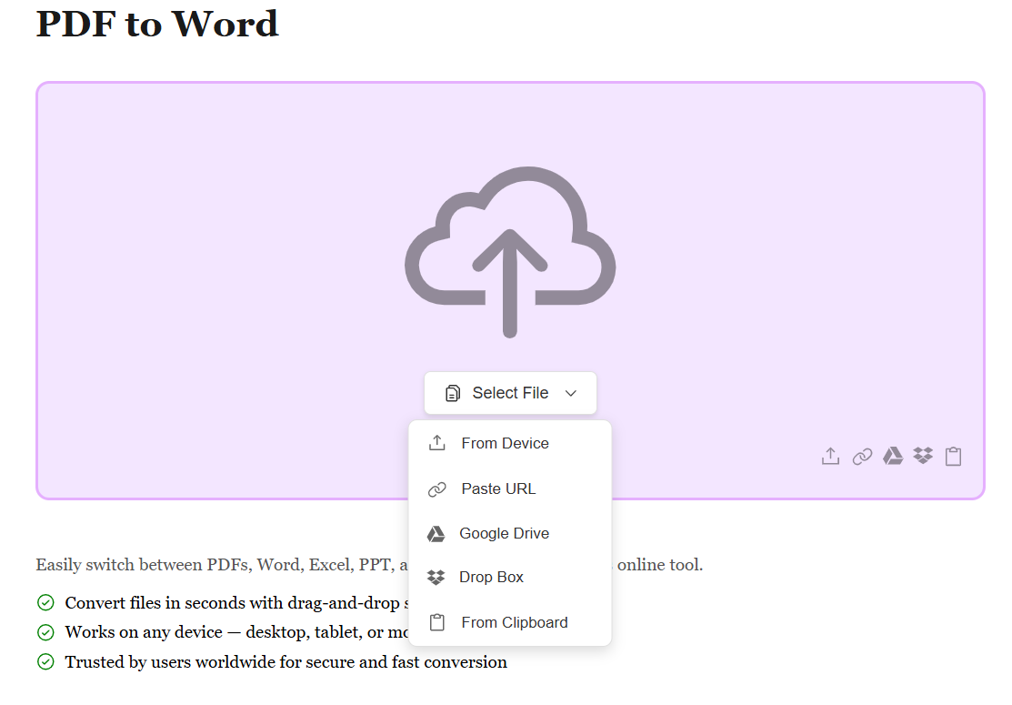 Start by uploading your PDF file using the method that works best for you. Whether it's from your device, Google Drive, Dropbox, or by pasting a file URL, we support all sources. No matter where your PDF is stored, converting it to an editable Word document is just a click away.