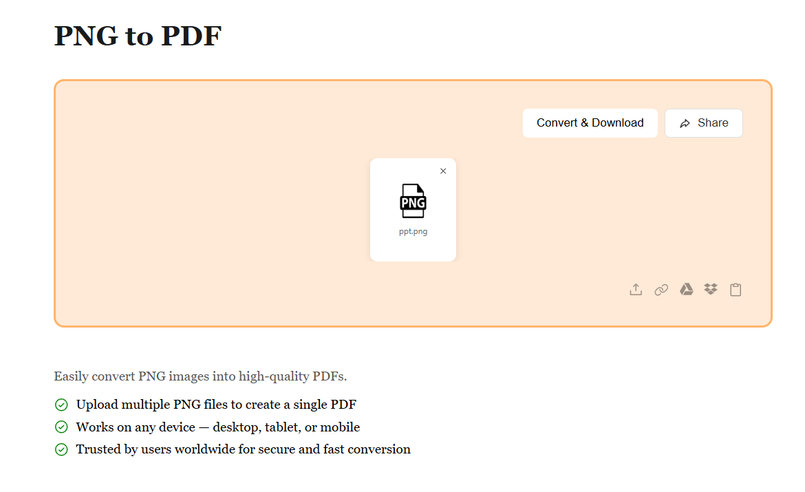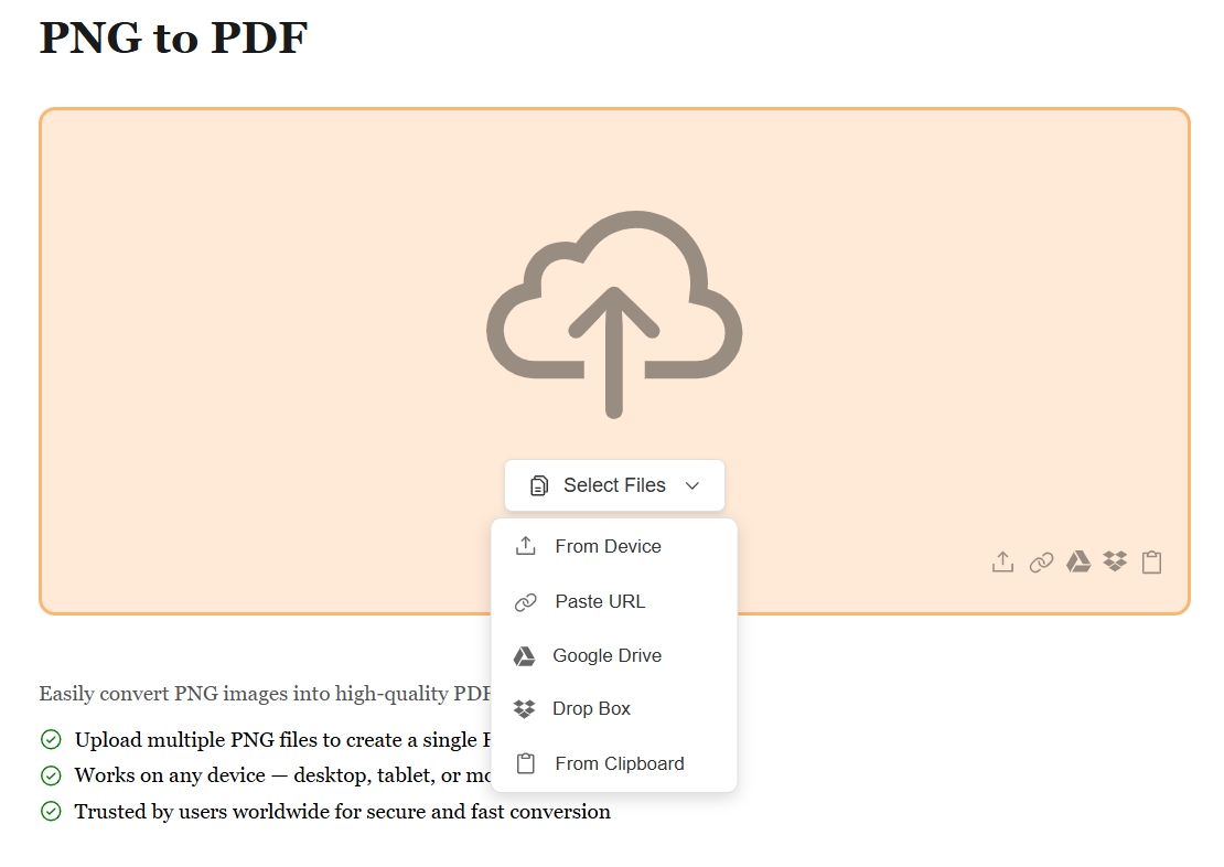 Start by uploading your PNG images using the method that works best for you. Whether it's from your device, Google Drive, Dropbox, or by pasting a file URL, we support all sources. Upload single or multiple images at once. No matter where your images are stored, converting them to PDF is just a click away.