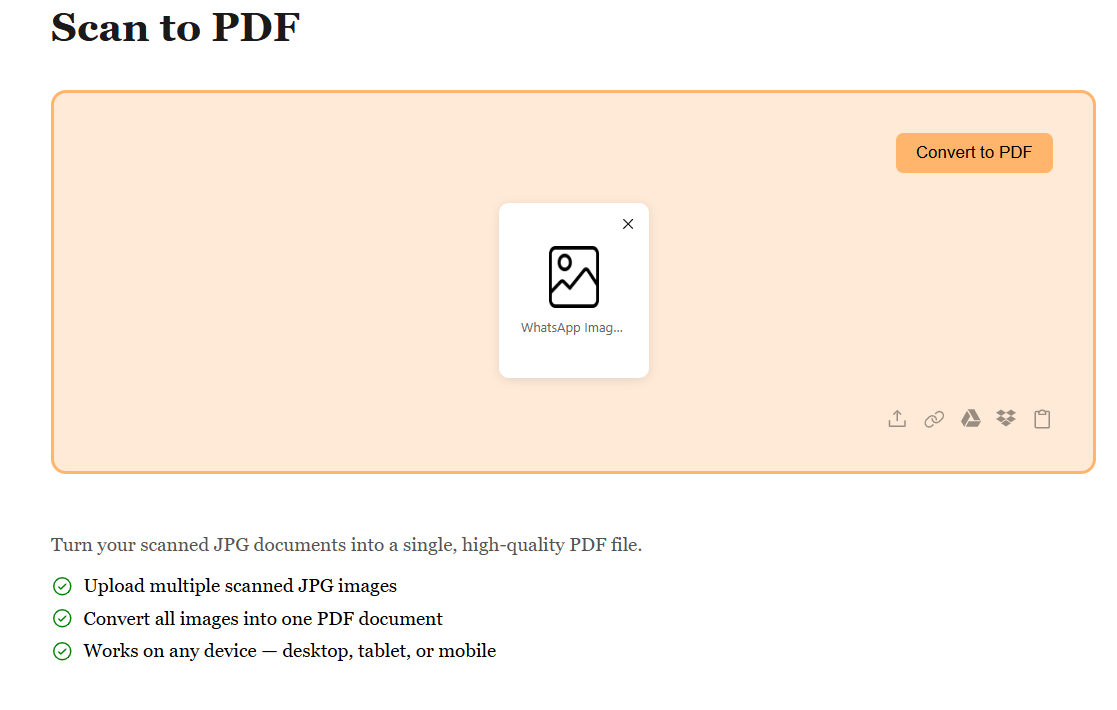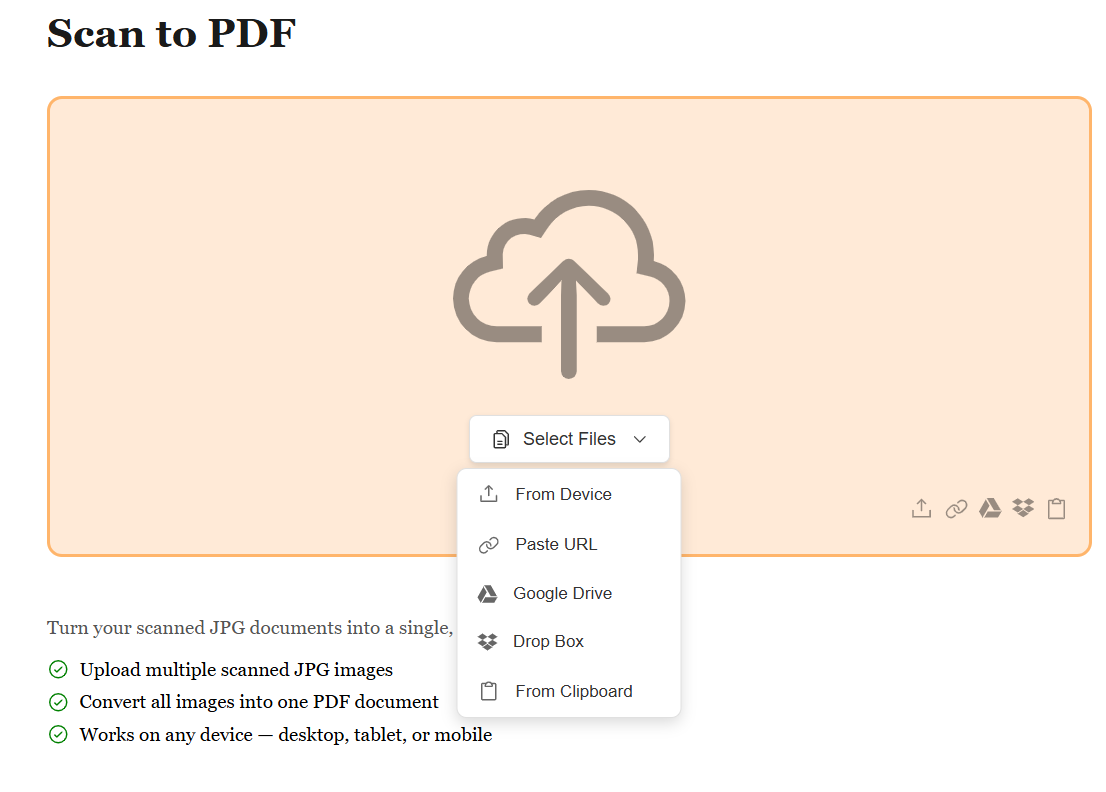 Start by uploading your scanned documents or images using the method that works best for you. Whether it's from your device, Google Drive, Dropbox, or by pasting a file URL, we support all sources. Upload single or multiple scanned pages at once. No matter where your scanned files are stored, converting them to PDF is just a click away.