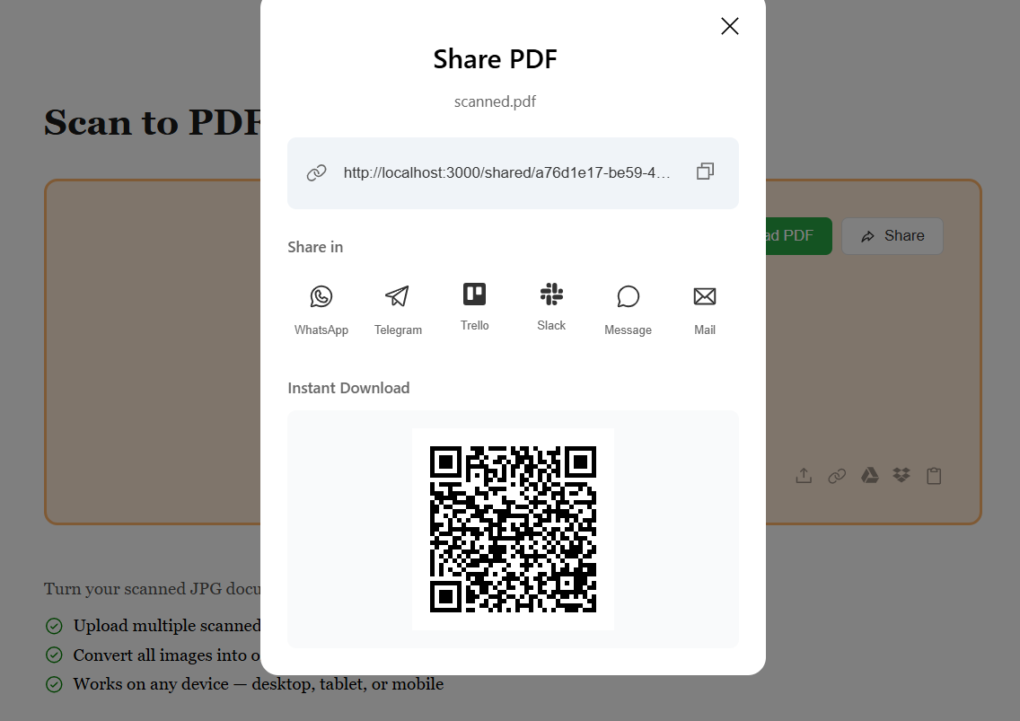 After arranging and enhancing your scans, hit the Convert button and your scanned documents are instantly transformed into a single PDF file. Preview the result and download your file. Your PDF is ready to share, archive, or print — with all pages optimized and perfectly formatted.