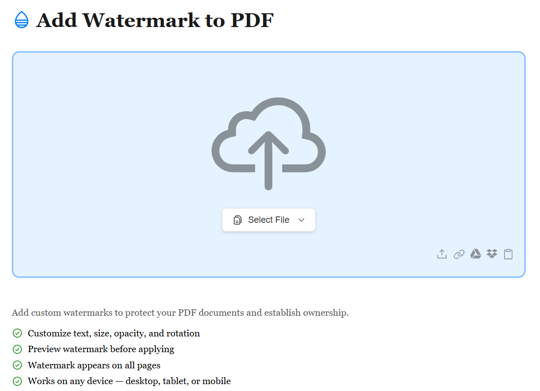 Start by uploading your PDF file using the method that works best for you. Whether it's from your device, Google Drive, Dropbox, or by pasting a file URL, we support all sources. No matter where your PDF is stored, adding a watermark for protection and branding is just a click away.