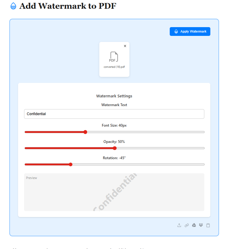 Once your PDF is uploaded, choose your watermark type — text or image. Customize the text content, font, size, color, opacity, rotation, and position. For image watermarks, upload your logo or signature and adjust placement. Preview your watermark in real-time to ensure it looks perfect on every page.