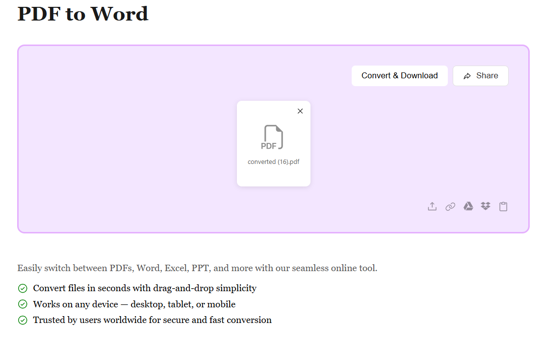 Start by uploading your PDF file using the method that works best for you. Whether it's from your device, Google Drive, Dropbox, or by pasting a file URL, we support all sources. No matter where your PDF is stored, converting it to an editable Word document is just a click away.
